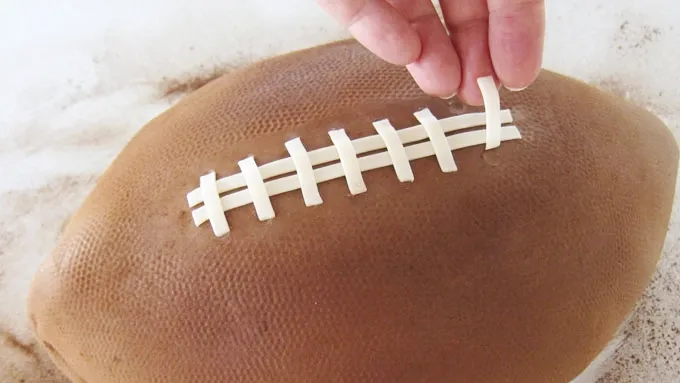 Step13Roll out white modeling chocolate, cut into thin strips, and create the laces on the ball. I started by adding two long laces to the cake, which I attached using a small amount of water. I then created large dimples along the edge of the laces to put the shorter laces into.