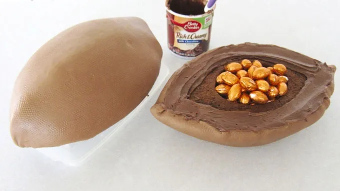 Step11Turn one cake upside down. Fill the well with chocolate footballs. Frost around the well, leaving 1/2 of space, so the frosting doesn't touch the candy.