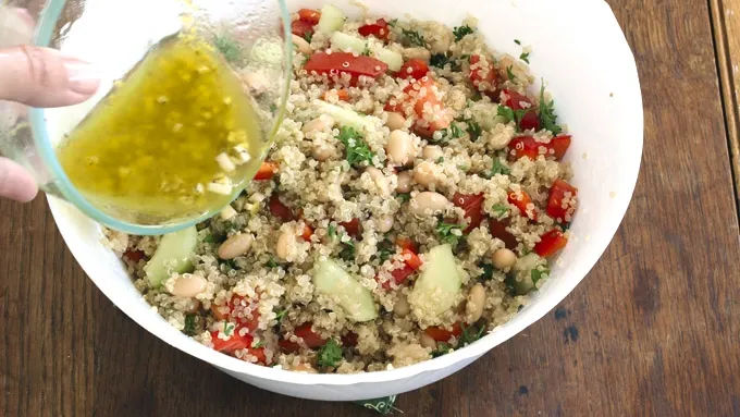 - We’ve all heard it before: Quinoa is crazy healthy. Still, here’s the thing. As inanely healthy as quinoa is, it’s not my favorite thing to eat. There, I said it. Try not to be mortally offended. And give me a chance to finish! That said… there are ways of preparing quinoa that not only make eating it tolerable, but actually enjoyable. This Garden-Fresh Lemon Quinoa Salad is a great example. It has a lot of great textures happening with the chewy quinoa, crunchy vegetables and soft white beans. Laced with the tangy flavor of lemon in an olive oil and garlic vinaigrette, this is not only an insanely healthy salad, it’s really yummy! Serve for lunch, as a light dinner with some crusty bread or a leafy green salad, or as a side dish for a larger meal.