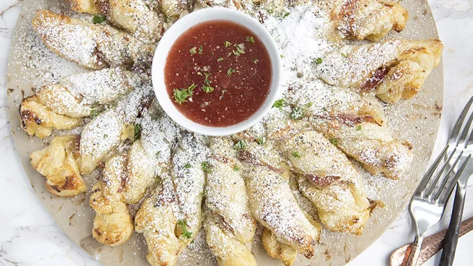 Step6Place a 2-inch bowl upside down in the middle of the puffed pastry. Starting on the outside edge of tart, cut a line between each piece of bacon, until cut reaches edges of bowl. Repeat, cutting tart into 16-24 strips or “rays”.