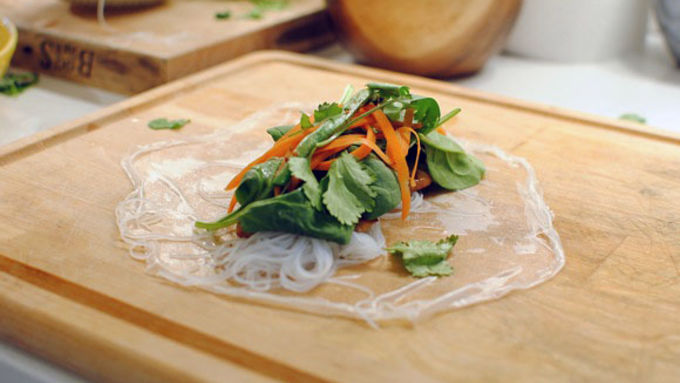 Step4Remove and carefully place on a flat surface. Layer the cooked vermicelli noodles, the chicken, spinach, carrots and cilantro right in the center of the paper.