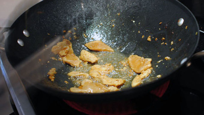 Step2Heat a large skillet or wok over medium-high. Add the chicken and sear on all sides until cooked through, about 5 minutes. Remove from heat.