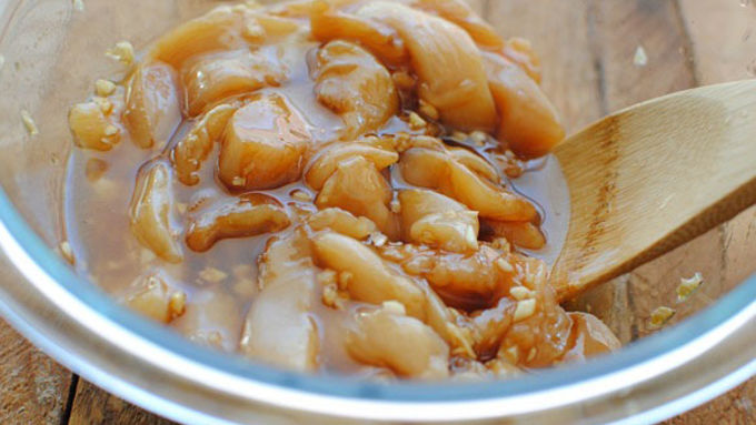 Step1In a bowl, combine the sliced chicken, vegetable oil, 2 tablespoons soy sauce, 2 teaspoons sesame oil and the minced garlic. Toss to coat the chicken well and marinate in the fridge for 20 minutes.