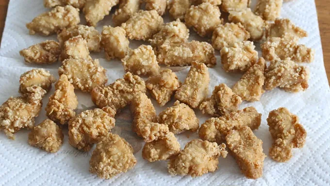 Step3Dredge the chicken pieces in the cornstarch and shake off the excess. Working in batches, deep fry the chicken in oil heated to 375°F until the chicken is golden brown, crispy and cooked through. Place the chicken on paper towels.