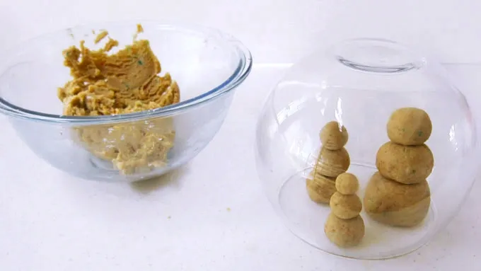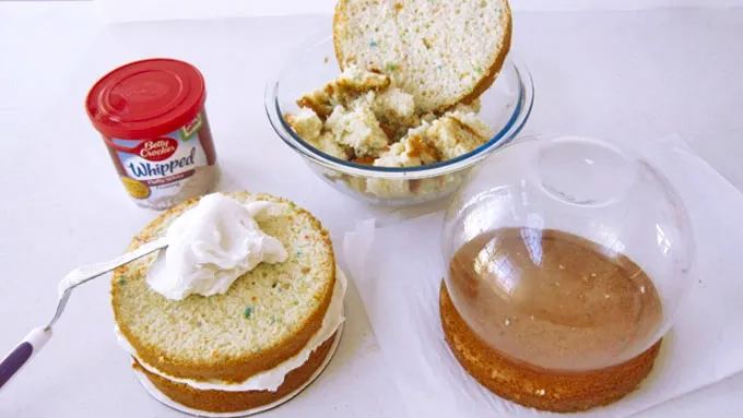 Step5Take all the remaining cake and crumble it in a bowl. Add 2 tablespoons of frosting and mix well to create cake ball dough. If needed, add more frosting a little at a time until the dough easily forms balls. Roll nine balls of dough in varying sizes to make three snowmen that will fit on top of your cake and under the glass dome you will be using to make your snow globe.
