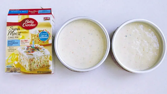 Step1Preheat oven to 325°F. Make cake mix according to package instructions. Spray two 6-inch round cake pans with baking spray. Evenly divide batter among pans.