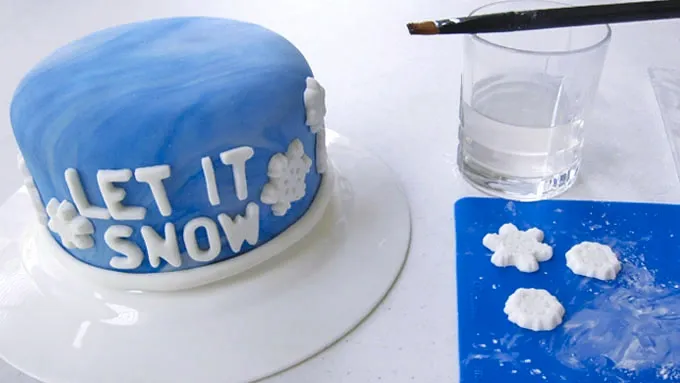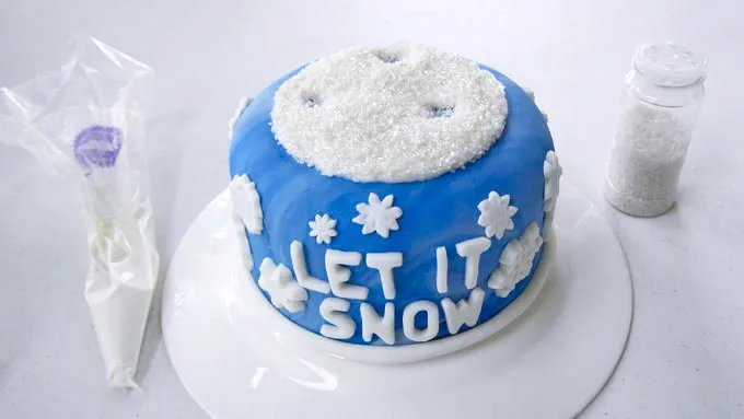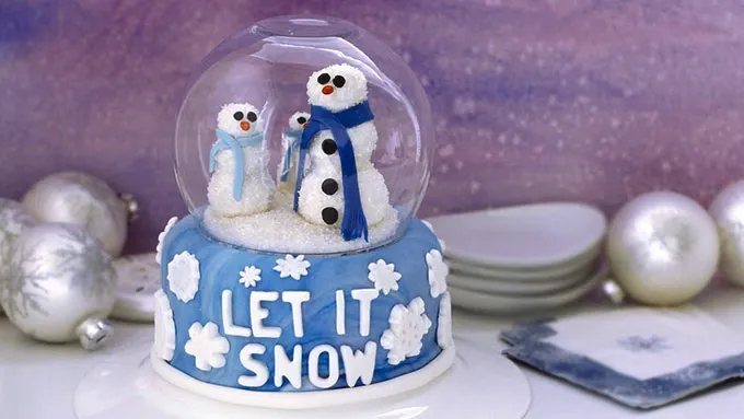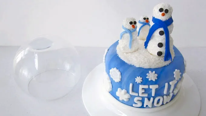 - This snow globe cake with tiny cake pop snowmen is the wintry treat every party needs. Seeing a snow globe for the first time is magical. I can remember getting one as a kid and being totally mesmerized by the falling snow and the tiny little figurines under the dome. I spent hours playing with it, shaking it and watching the snow fly. I remember thinking how cold the people in my globe must be with all the water and snow swirling around them. I'm sure my young brain understood they weren't real, but my vivid imagination made me think otherwise! So, when I set out to create my own snow globe out of cake, I decided to put snowmen inside – since they’re made of snow and I'm pretty sure they really like the cold. You can put just about anything inside, so have fun and get creative! After baking my cakes I like to pop my cakes into the freezer for a few hours so they are easier to frost, but you can skip this if you like and just go straight to frosting them after they're cooled and you've cut the domes off. Personalize the base of your snow globe using fondant decorations. I rolled out white fondant and cut out the words, "Let it Snow" along with some snowflakes, then attached them with a small amount of water. To make the snowflakes, I dusted a candy mold with a lot of corn starch, pressed fondant into the snowflake cavities, turned the mold upside down, and tapped it until the fondant snowflakes fell out. You can also use cookies cutters or plunger cutters to make the snowflakes. When you place the glass globe on top, if you need to have the globe on the cake for several hours, add dowels inside the cake for support. Serve this snow globe cake at your next holiday party for a special, magical treat!