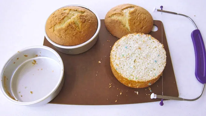 Step2Bake cakes for 45-48 minutes, until a toothpick inserted in the cake comes out clean. Allow cakes to cool for 15 minutes, then remove them from pans and allow them to cool completely. Cut domed top off of cakes and cut each cake into two even layers.