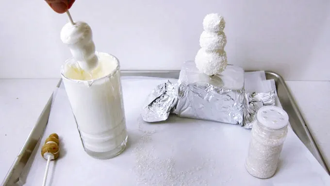 Step7Dip each snowman into the white confectionery coating, remove and allow excess coating to drip off. You may need to run your finger around the grooves to remove enough candy coating to really see the shape of the snowmen. Don't worry about being messy, you won't see it. Immediately sprinkle the shimmering decorating sugar all over the snowman. You'll need to stand the pops up until they're dry. You can use a cake pop stand or a piece of Styrofoam. Pop the snowman in the freezer for 3-5 minutes until the candy coating is hard. Repeat, dipping all the snowmen cake pops.