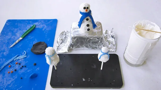 Step8Decorate the snowmen with black fondant eyes and buttons, an orange sunflower seed nose and fondant scarfs. Reserve 2 ounces of white fondant.