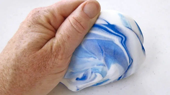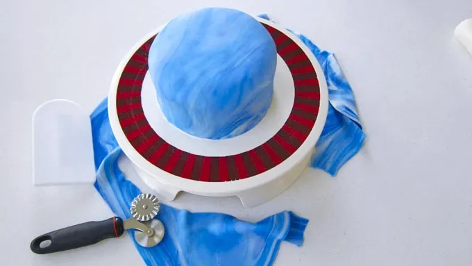 Step9Knead the remaining 12 ounces of white fondant with the blue fondant just until the colors swirl together.