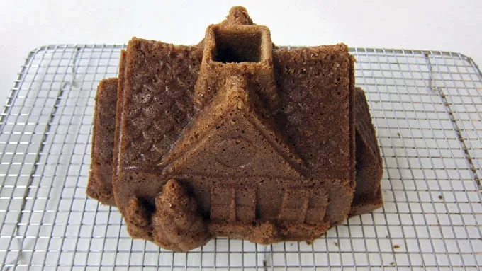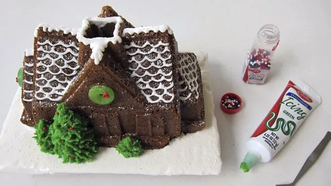 - Set a baking pan on the rack below the cake, just in case the batter overflows the pan. There is a hole in the center of the pan to allow excess batter to seep out of the bottom of the pan. Do as much or as little as you'd like to your cake. Set the cake on a serving platter or a cake board covered in white cookie icing. You can pipe shingles onto the roof of the gingerbread house. Add some icing snow to the roofline. If you'd like to add some wreaths above the doors, use some green ring candies, attach a few red candy pearls using cookie icing, then attach the wreaths to the cake using more cookie icing. Then you can pipe some green frosting onto the trees, add some red candy pearls, and sprinkle some powdered sugar snow over top. This gingerbread cake will look just as good on your holiday table as the house you cleaned for days. Happy Holidays!