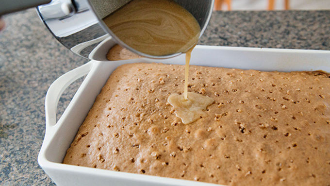 Step3Poke the cake with a fork or toothpick and pour hot syrup all over cake. Let cool.