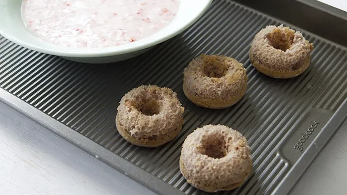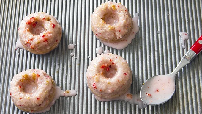 Step3Dip warm donuts into the strawberry icing. Use a spoon to drizzle the icing to fill in all over. Place donuts on a cooling rack until icing sets, about 10 minutes. Enjoy!
