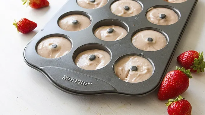 Step1Preheat oven to 350°F. In a mixing bowl or stand mixer, beat together Betty Crocker™ cake mix, eggs, butter and fruit spread. Spoon into a lightly greased donut pan. Bake for 8-12 minutes for mini donut pans (or 10-16 minutes for large donut pans). When the donuts spring back lightly to the touch, remove and cool slightly before removing from the pan.