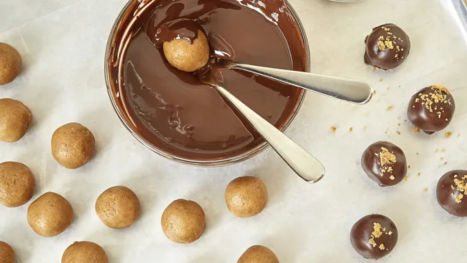 Step4Remove half of the cookie balls from refrigerator. Using 2 forks, dip and roll chilled cookie balls, one at a time, in melted chocolate. Return to lined cookie sheet; immediately sprinkle top with crushed cookie crumbs. If chocolate has cooled too much, reheat. Refrigerate truffles about 10 minutes or until coating is set. Repeat with second half of cookie balls. Store covered in refrigerator.