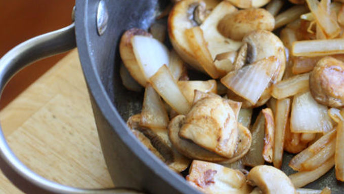 Step1Add olive oil to a large skillet over medium heat. Add onions and mushrooms and cook for 10 minutes or until vegetables are soft.