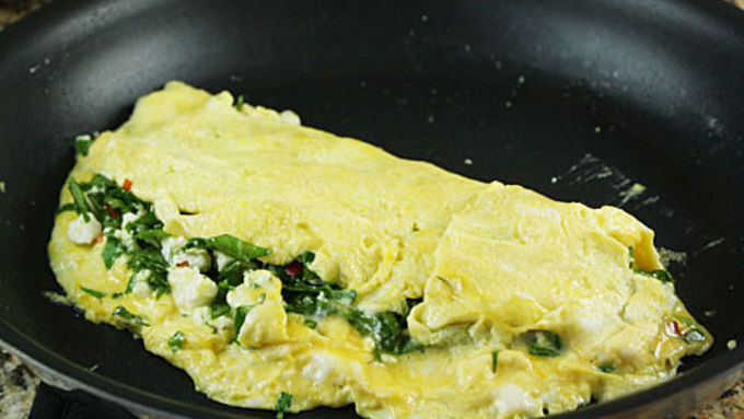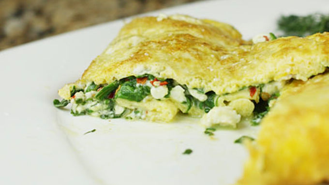 - Greek flavors are some of my favorites, and my definition of classic Greek food is spanakopita. Now, you might wonder why I'm mentioning spanakopita when I'm clearly making an omelet... Because this omelet is basically stuffed with spanakopita filling! The combination of spinach, fresh dill, and salty feta cheese is almost good enough to just eat with a spoon. But stuffing it into a light and fluffy omelet is even better—and a whole lot easier than making the traditional puff pastry dish! This recipe takes no time to make. It's important to get really fresh ingredients though. A few fresh eggs, good feta cheese, and fresh spinach and dill will make this dish pop with flavor. To make your life easier when you're making the omelet, I recommend mixing your filling ingredients prior to cooking your omelet. Just chop up the spinach and mince the dill really finely. Then crumble in the feta and red pepper flakes if you're using them. When it comes time to make the omelet, the key is to not stress out about it! Remember that even if your finished omelet doesn't look perfect, it will taste delicious. Since this is a pretty big omelet, I upgraded my pan size a bit. You can use a smaller (10 inch) omelet pan if you don't mind your eggs being a bit thicker. Or you can decrease the number of eggs down to two. This omelet was almost big enough for two. I say almost because I had no problem finishing it all by myself. If you're looking for a new omelet filling option, give this a shot!