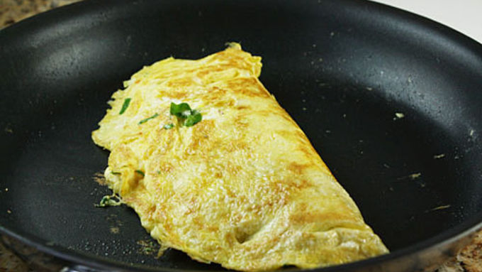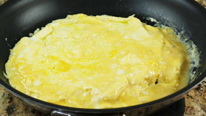 Step4When the eggs are set on the bottom but still a bit runny on top, add filling to half of the egg and carefully fold egg over to enclose the filling.