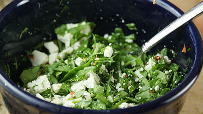 Step1Chop spinach and mix well with minced dill and crumbled feta. Set aside.