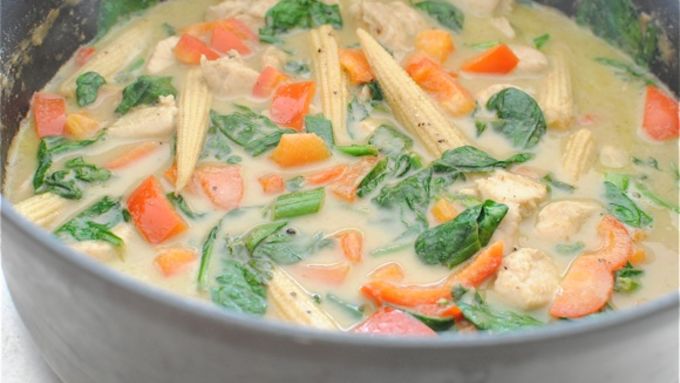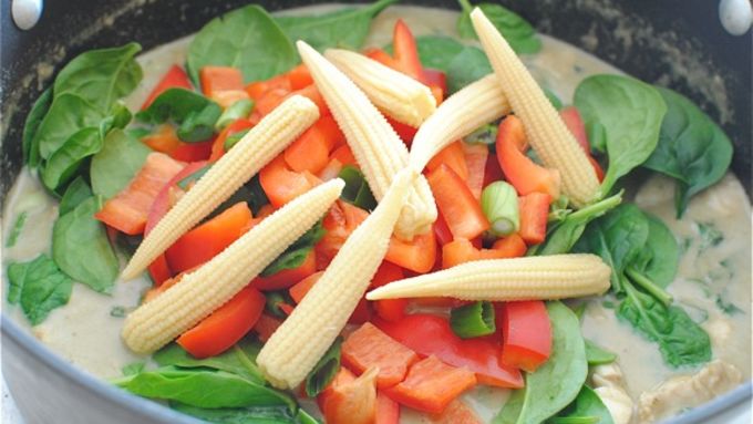 Step2Add the chicken and simmer for 4 minutes. Then stir in the spinach, red bell pepper, half the scallions, half the cilantro and the corn. Cover and cook another 5 minutes, until the chicken is cooked through.