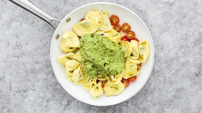 - I like to keep frozen tortellini and ravioli in my freezer for dinner emergencies. All you’ll need is a yummy sauce, and voila…dinner is on the table in less than 30 minutes. It doesn't get easier than that! The green goddess pesto, as I call it, is inspired by the famous salad dressing. It's made with spinach, mint and basil. I decided to add yogurt instead of mayo, to make it healthier, and the final result was a creamy and flavorful sauce. There’s so much flavor, and it pairs amazingly with my go-to tortellini from the store. It’s a sensational meal that goes from the stove to your plate in no time flat. Happy cooking!