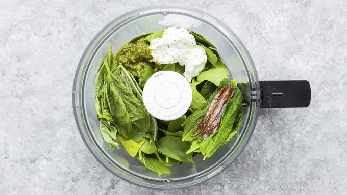 Step1Place spinach, basil, mint, yogurt, pesto, 2 tablespoons olive oil, anchovies and black pepper in a food processor. Cover; pulse until well combined.