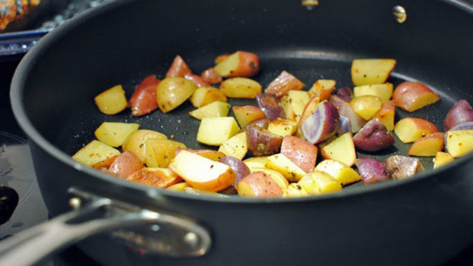 Step5In the meantime, heat the oil in a medium skillet over medium-high. Add the diced potatoes and saute until crisp on the outside and soft on the inside, about 20 minutes. Season with salt and pepper.