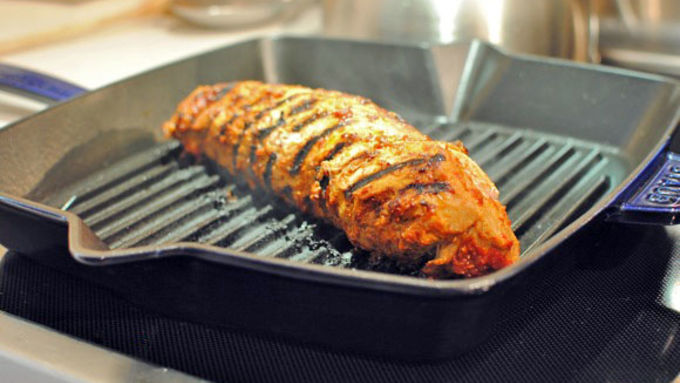 Step4Heat an indoor or outdoor grill over medium. Add the tenderloin and grill until cooked through, rotating the meat every 7 minutes to get grill marks, about 45 minutes total. Remove from grill, cover and let rest 10 minutes.