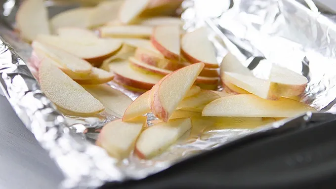 Step2Place sliced apples in a parchment-lined 9x9-inch baking pan. Drizzle with 2 tablespoons melted butter and honey. Roast in preheated oven for 15-20 minutes, just until the apples become tender and the honey and butter begin to reduce and thicken.