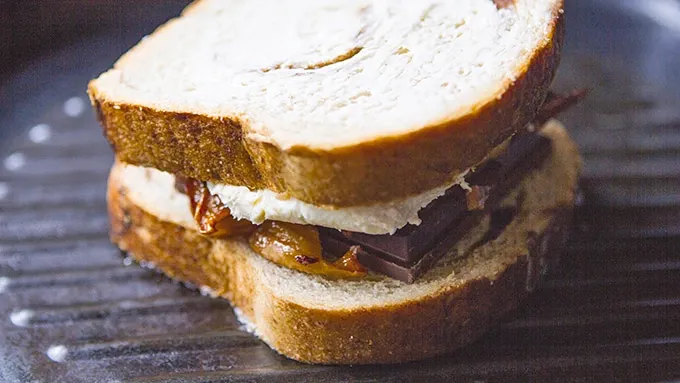 Step4Remove apples from oven. Drizzle remaining butter on two outer sides of the bread. Place bread (butter side down) on a clean cutting board. Spoon roasted apples on one side. Slather brie on the second side. Place the candy bar on top of the brie. Press the sandwich gently together. Grill until golden brown on one side. Flip and grill on the second side until golden brown.
