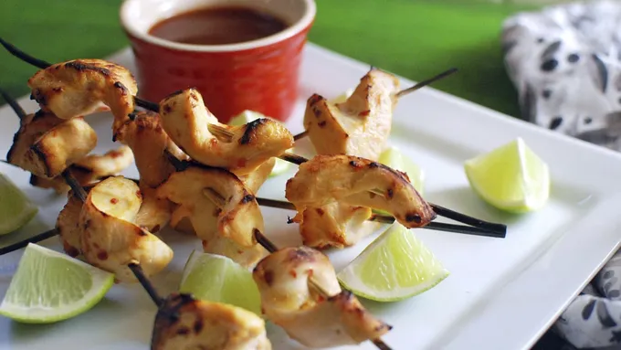 When you’re ready to cook, skewer the chicken on soaked bamboo skewers (or metal ones if you have them). Between every other piece of chicken, skewer a thin slice of lemon. The lemon will give the kabobs a little extra moisture and add to the citrus flavors.