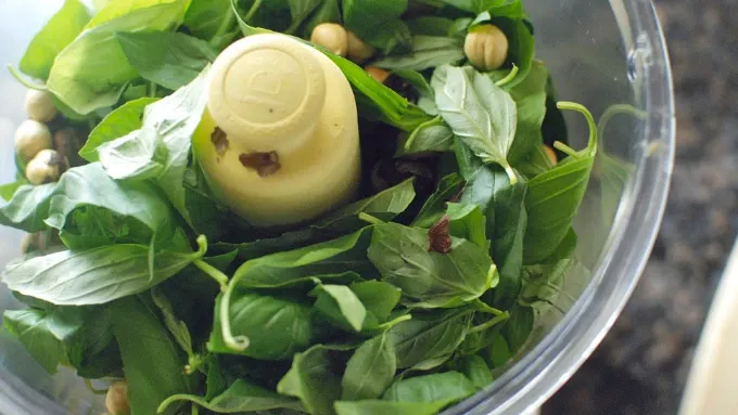 Step2To make the pesto, remove some of the woodier stems from the basil. Place the basil into the food processor with the rest of the pesto ingredients. Process the pesto while adding olive oil until you reach your desired consistency.