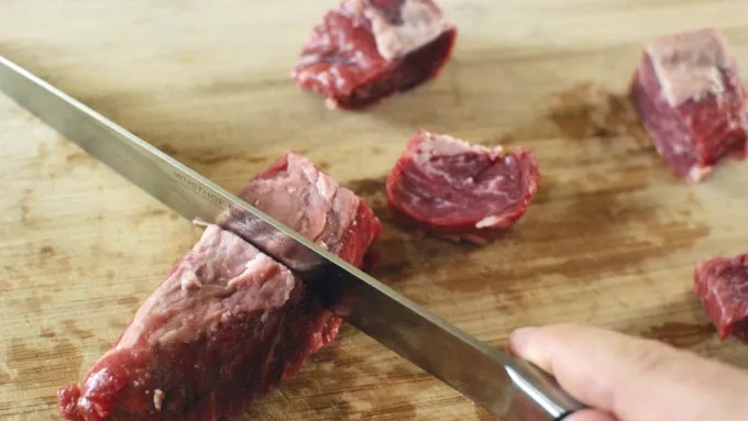Step1Cut the steak into squares of about 1.5 to 2 inches. Mix the steak with the rest of the marinade ingredients. Allow to marinate for at least an hour, up to 6 hours.