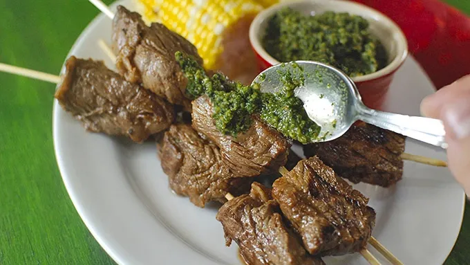 - Dress up tender sirloin steak with homemade hazelnut pesto. Pesto is commonly regulated to pasta, but in reality it's insanely versatile and can be used in so many different ways. I like to put mine on steak fresh off the grill. It makes for an Italian spin on the chimichurri sauce that's popular with grilled meats in South America. To switch up my pesto this week, I decided to trade pine nuts for hazelnuts to add a totally different dimension to the sauce. Hazelnuts have a much nuttier and complex flavor that can take your pesto to the next level! Plate up these tender kabobs with the pesto on the side. Or, you could do what I do and apply the pesto with either a spoon or brush onto the steak kabobs when they're fresh off the grill so the cheese and oil soften up and the pesto melts onto the steak.