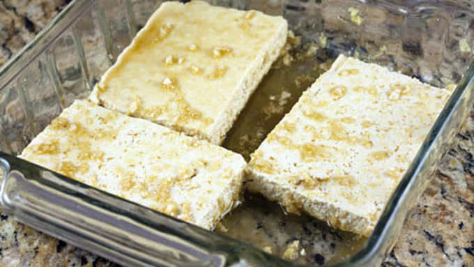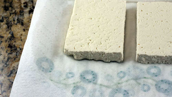 Step2Cut tofu into 3 sheets. Set tofu on paper towels and press with some weight to press out water. Let sit for 10 minutes.