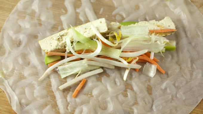 Step5If you want to make spring rolls, wet a wrapper and add a few pieces of tofu to the center of the wrap. Pile the wrap high with veggies and then roll it tightly.
