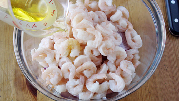 Step1Heat a charcoal or gas grill to medium-high heat. In a large bowl, toss shrimp and onions with olive oil and salt and pepper. Place shrimp on skewers.