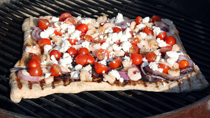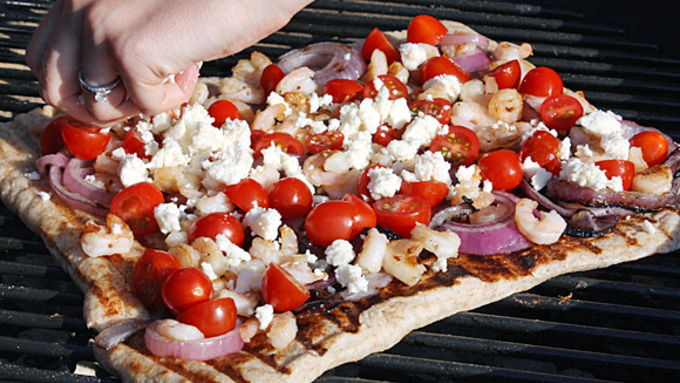 - If you need more awesome in your life, I’m here to help. See, it all starts with a grill. Add the new DELISH Pillsbury Artisan Pizza Crust, some shrimp, some veggies and cheese, and dudes (and dudettes) – you’ve got yourselves a seriously awesome Grilled Shrimp Pizza. I’ve been a big fan of grilled pizza for some time now. The slight char added to the crust is just tasty, just crunchy, just flavorful enough to elevate this regular ol’ shrimp pizza to AWESOME level. Plus, the shrimp and onions on top also are grilled, so it’s double grilled and therefore doubly awesome. You get the idea. First, be sure you have all of your ingredients chopped, sliced, measured and ready to roll. The pizza grills quite quickly so you won’t have any free time to perfect your chopping skills between steps. Top that purdy pizza with chopped fresh cilantro, and serve! More awesome in your life in about a half hour… oh, and dinner, too.