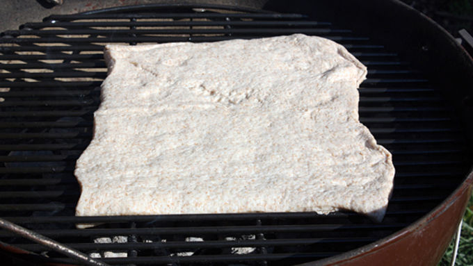 Step3Reduce grill heat to medium. Brush grill top with olive oil (or spray with cooking spray) and place pizza crust in center of grill. Cook until bubbles begin to form on top, about 2-3 minutes. Using tongs, flip crust and brush top of crust with olive oil.