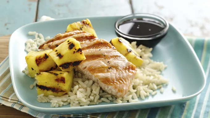 Step7Place the salmon on individual plates and coat with the pineapple sauce. Serve immediately.
