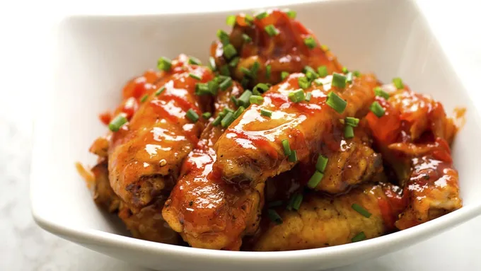 Step5Toss cooked wings with 1/2 cup of fresh sweet and sour sauce (NOT the sauce used to marinate the raw wings) then serve the wings sprinkled with chopped green onion.