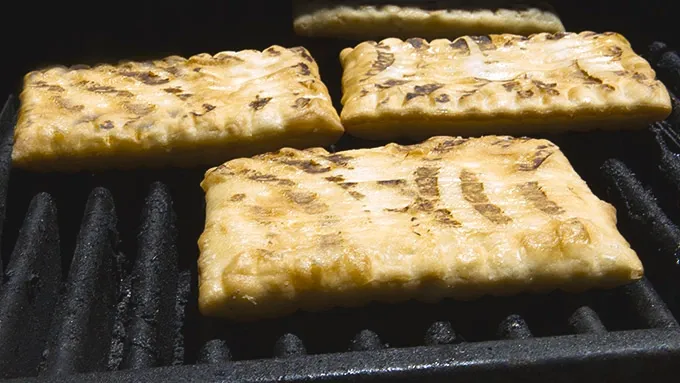 Step1Preheat grill to medium-low heat. Place Toaster Strudel directly on grill grate and cook for 3-5 minutes or until thoroughly cooked and heated throughout, turning once with a spatula to allow both sides to get flaky and golden. Remove Strudels from the grill to a cutting board, allow them to cool slightly.