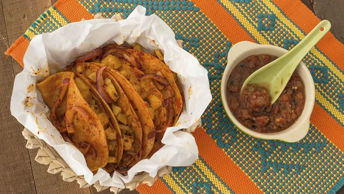Step4Heat the tortillas and fill with the meat and potato mixture.