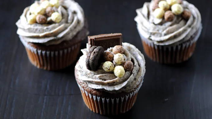 Step3Frost the cupcakes with the vanilla frosting. Use the Oreos on top to form a dirt mound. Insert the groundhog bar into the top center of a cupcake so it looks like he is popping out of the top.