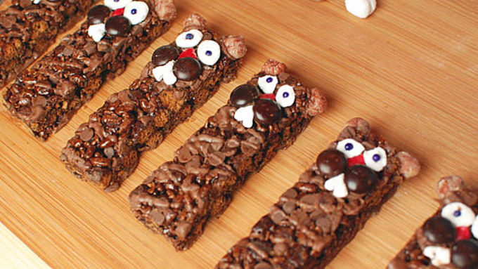 Step2Start with a Cocoa Puffs™ bar. Using chocolate frosting as the glue, glue the face features to the bar to make the Groundhog -- Reese's Puffs® are the ears, the marshmallows are cut to form the eyes and the teeth, the brown M&M's® are the cheeks, the Fruit Roll Up is the nose, and the little round sprinkles are the eyeballs.