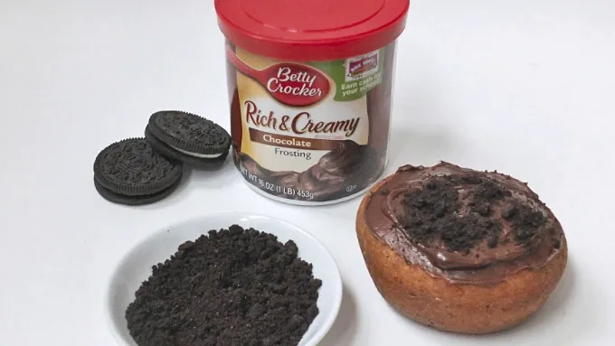Step1Frost the top of the donut with chocolate frosting, and then sprinkle frosting with crushed Oreo™.