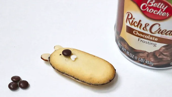 Step3Attach mini M&M™ with frosting for the nose. Turn the white heart sprinkle upside down and attach with frosting for the teeth.