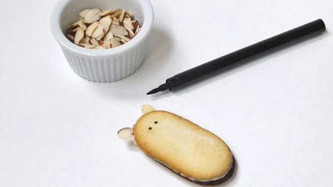 Step2On one end of the cookie, push the almond slices into the filling of the cookie for the ears. Draw eyes and mouth onto cookie with the black edible marker.