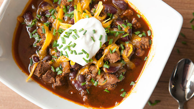 Step5Keep chili warm over low heat and serve chili in big bowls garnished with sour cream, grated cheddar cheese, and fresh chives.